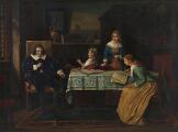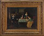 Interior with a man and three women around a table. Signed August Mansfeld. Oil on canvas. 74×101 cm.