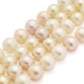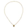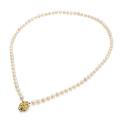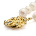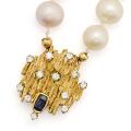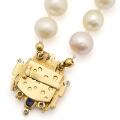 Perlehalskæde prydet med talrige ferskvandsperler og lås af 18 kt. guld og hvidguld prydet med fancy-cut safir og talrige brillantslebne diamanter. Lås 2,2×2,6 cm. Perlediam. ca. 8–9 mm. L. ca. 92 cm.