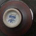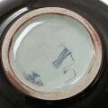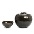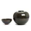 Vase og skål af stentøj, dekoreret med hhv. brun- og blållig glasur samt grøn/brun glasur, vase yderligere dekoreret med motiv i let relief i form af blade. Sign. monogram. Udført hos Royal Copenhagen. H. 6 og 16. Diam. 18 og 12,5. (2)