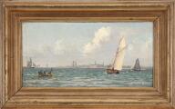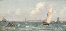 Marine med livlig trafik udfor Kronborgs kyst. Sign. V. Arnesen 05. 22,5×44 cm.