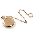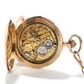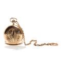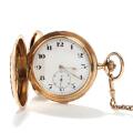 Dobbeltkapslet lommeur af 14 kt. guld, prydet med monogram AW, hvidemaljeret skive med arabertal og små sekunder, støvkapsel af 14 kt. guld. Værk med timeslag. Medfølgende urkæde af 14 kt. guld. Ca. 1900. Samlet vægt 115 gr. Diam. 5,5.