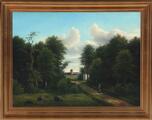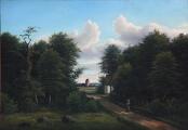 Forest path with a walking woman, in the background a Danish village church. Signed and dated Rudolph Møller 1865. Oil on canvas. 51×71 cm.