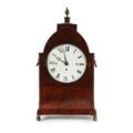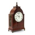 An English Regency musical mahogany case table clock in Gothic style, dial of white enamel with later painted black Roman numbers, the movement with quater striking and chimes 'Westminster'. Ca. 1830. H. 62 cm. W. 32 cm. D. 17 cm.