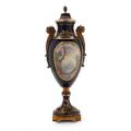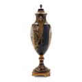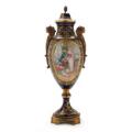 A French 19th century Napoleon III lidded porcelain and gilt bronze vase, painted in colours and gold on bleu royal ground, handles in shape of winged caryatides, faux Sevres mark. H. 64 cm.