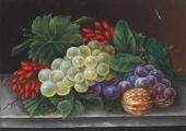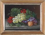 Still life with fruits and leaves. Unsigned. Oil on wood. 15.5×21 cm.