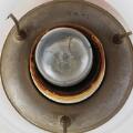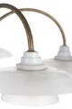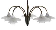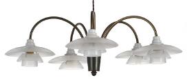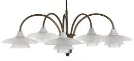 “Bombardement”. Femarmet lysekrone af messing. Fatningshuse af hvid bakelit. 2/1 skærmsæt af matglas. Udført hos Louis Poulsen, ca. 1940'erne. H. 25. Diam. 70.