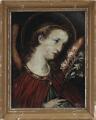 An angel holding a white lily. Unsigned. Oil on panel laid on copper plate. Visible size ca. 22×16.6 cm.