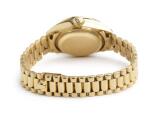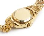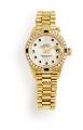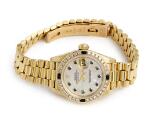 Datejust af 18 kt. guld, ref. 69088. Mekanisk værk med automatisk optræk og dato, cal. 2135. 1995 (solgt 1999). Perlemorsskive med safirer. Krans med safirer og diamanter. ”President”-lænke af 18 kt. guld. Omkreds cirka 15,5 cm. Ø 26 mm.