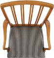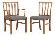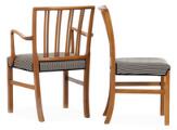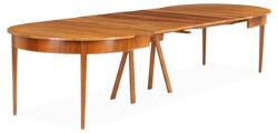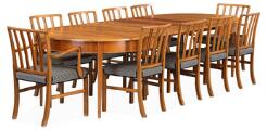 Spisebord af nøddetræ med udtræk og fem tillægsplader samt ti stole af bøg, heraf to med armlæn. Sæde betrukket med stribet stof. Stol: Model 1675. Stole udført hos Fritz Hansen. Bord: H. 75. Diam./L. 120/300. (16)