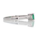 An emerald and diamond ring set with an faceted emerald flanked by princess- and brilliant-cut diamonds, mounted in 14k white gold. Size 55.