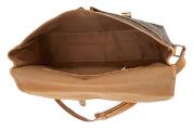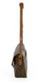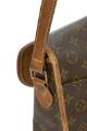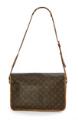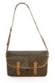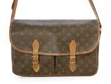 A “Gibeciere” bag of brown monogram canvas with brown leather trimmings, gold tone hardware, adjustable shoulder strap, two exterior front pockets, one compartment with one interior zipped pocket and brown fabric lining. H. 27 x W. 38 x D. 11 cm.