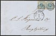 1854. 2 sk. blå. Parstykke på landsportobrev fra AARHUS 14.4 (1863) til Ringkøbing. Ann. med nr.stempel 5. Sjældent. Attest Kaiser [ 3 ] [ ✉ ]