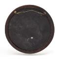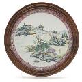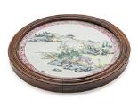 A Chinese famille rose plaque painted with mountainous landscape with pagodas and shoreline, late Qing/Republic. Tondo Diam. 24.5 cm. Hardwood frame Diam. 28.5 cm.