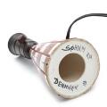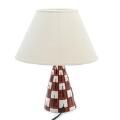 A table lamp with conical ceramic base, decorated with black, yellow and green glazes on light base. Signed monogram RN. Made and signed by Søholm. H. excl. socket 15.5 cm. H. incl. shade 30 cm.