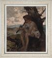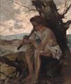 A landscape at dawn with a youth playing the flute. Indistinct signature sign. Oil on canvas. 70×59 cm.