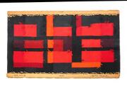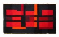 “Hur Joh II”. Håndvævet vægtæppe af uld, vævet med geometrisk dekor i sort, gråt, rødt, orange og vinrødt. Sign. Jette Thyssen. Monteret på trælister. Unik. H. 40,5. L. 68.