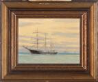 Seascape with ships on a quiet sea. Signed and dated V. Qvistorff, 1939. Oil on paper laid on cardboard. 18×23 cm.