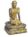 A gilt bronze figure of Phosop, the rice goddess, crowned and dressed with gown and sabai, seated on a foursided throne. Thailand, Rattanakosin period, 19th century. H: 106cm. B: 64cm. D: 65cm