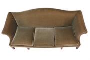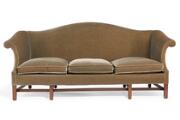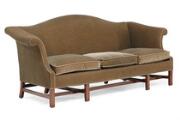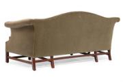 An English freestanding camelback mahogany sofa, upholstered with green velour. 20th century. L. 200 cm.
