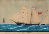 “Axel af Odense” ført af Kaptajn A. H. Krabek. Usigneret. Gouache på papir. Lysmål 59×84 cm.