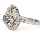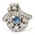 A sapphire and diamond ring set with a circular-cut sapphire and numerous brilliant and single-cut diamonds, mounted in white gilded silver. Weight app. 6 g. W. 19 mm. Size 57.