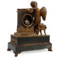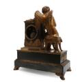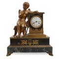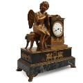A French 19th century gilt and patinated bronze mantle clock, decorated with a seated Amor with the bow, white enameled dial with black Roman numerals signed Bailly à Paris, greenish marble base. H. 45 cm.