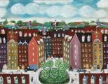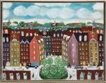 “By med rundkørsel” 1978. Signed KEF; signed, titled and dated on the reverse. Oil on canvas. 35×45 cm.