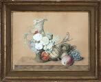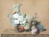 Opstilling med frugter, blomster og fugl på en karm. Usigneret. Bly og gouache på papir. Lysmål 32×42 cm.