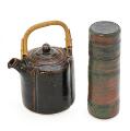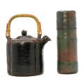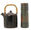 A cylindrical lid jar and teapot of high fire earthenware. The teapot with bamboo handle. Decorated with resp. reddish brown, blue and green glaze and with black and reddish brown glaze. Marked monogram. Unique. Lid jar: H. 42.2 cm. Teapot: H. incl. handle 24 cm. (2)