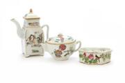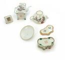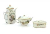Kinesisk tekande/tekop af porcelæn, dekoreret i emaljefarver med scenerier. H. 8 cm: derudover en vinkande malet med Laotse og poesi H. 17 cm; samt et cikadebur L. 12 cm. 20. årh. (3)