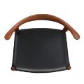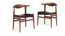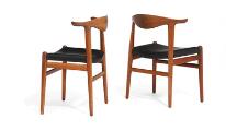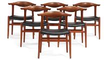 “Kohornstolen”. Et sæt på seks stole af massiv teak, indlægninger af palisander i ryg. Sæde betrukket med sort skind. Model JH 505. Formgivet 1952. Udført 1950–1960'erne hos snedkermester Johannes Hansen, ej mærket. (6)