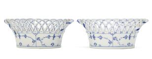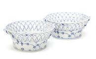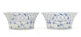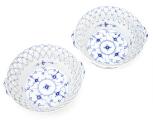 “Blue Fluted Full Lace” a pair of openwork porcelain baskets, decorated in underglaze blue. 1050. Royal Copenhagen 1898–1922. Diam. 19 cm. H. 8 cm. (2)