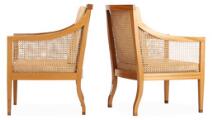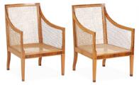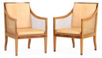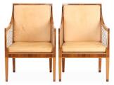 A pair of bergeres with mahogany frame, rosewood inlays and “shoes”. Seat, sides and back with woven cane. Loose cushions in seat and back upholstered with light natural leather. Model 4488. Designed 1931. Made 1980s by Rud. Rasmussen Cabinetmakers, with maker's paper label. (2)