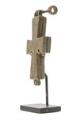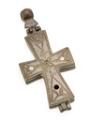 A Byzantine bronze “Enkolpion”, front engraved with Christ Pantokrator, back with flowers. With stand. 8th-12th century. H. total 12 cm.