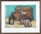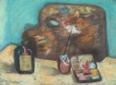 Still life with a palette, a colour box and a bottle. 1925. Signed John Christensen 25. Crayon on paper. Visible size 34×46 cm.