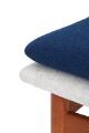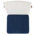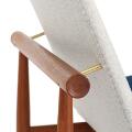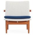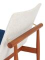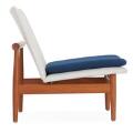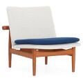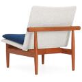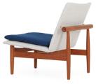 “Japanstol”. Lænestol med stel af teak, beslag af messing. Sæde og ryg betrukket lyst uld, samt løs hynde af blå uld. Model FD 137/1. Udført og mærket hos France & Søn.