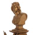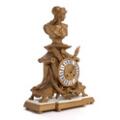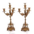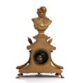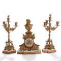 A French 19th century bronze metal mantel clock and a pair of candelabras, richly cast with Minerva bust, pikes and festoons, white- and goldpainted wooden bases. H. excl. bases 41 and 46 cm. (3)