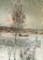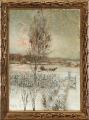 Vinterlandskab med slædekørsel i den sene eftermiddagssol. Sign. Hugo V. P. Olie på lærred. 56×40 cm.