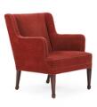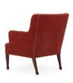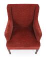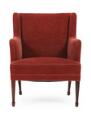 Lænestol med ben af mahogni, betrukket med rødt velour. Udført hos snedkermester Frits Henningsen. 1930–40'erne.