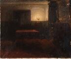 Et interiør med levende lys. Sign. Jul. P. 09. Olie på lærred. 54×65. Uindrammet.