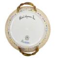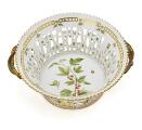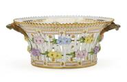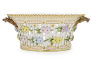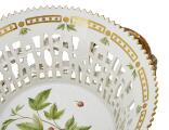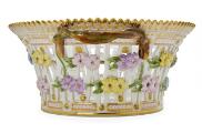 “Frugtstellet” porcelain fruit basket, pierced, painted in colours and gold, adorned with repoussé flowers, handles moulded like twigs. 3532. Royal Copenhagen. H. 8.5 cm. Diam. 18.5 cm.