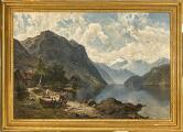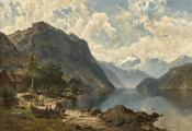 View of a mountain lake with a family by a boat. Signed and dated E. Bergh 1878. Oil on canvas. 103×149 cm.