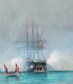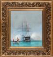 Scene with a sip beging saluted by the Royal shallop in the foreground. Signed H. Lübbers. Oil on canvas. 31×27 cm.
