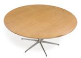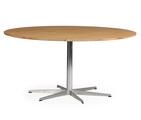 Circular oak dining table on 6-star base with a satin polished aluminium foot and a chromed steel pedestal. Model A826. Manufactured by Fritz Hansen. H. 70 cm. Diam. 145 cm.