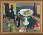 Still life with wine bottles and fruit. Signed Herdis Gelardi. Oil on comnpoboard. 39.5×50 cm.