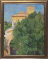 En romersk villa bag grønne træer. Betegnet Aksel? Jörgensen, Roma 1934. Olie på lærred. 58,5×45,5.