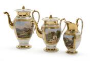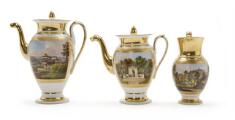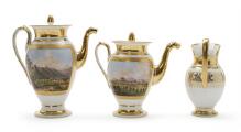 A German late Empire prospect porcelain service, comprising coffee- and teapot plus a milk jug, decorated in colors and gold on white gound, coffepot with “Schloss Ballenstedt”, tepot with “Klopstocks Denmal zu Quedlinburg” and milk jug with “Der Fallzenstein”. Coffee- and teapot including lids with air wholes. Unmarked. First half-19th century. H. 25, 21 and 20 cm. (5)