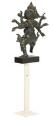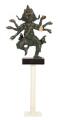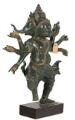 Ganesha/Phra Phikanet. A Thai green-painted and bronzed metal figure with three heads and six arms, each hand holding different attributes, standing on a rectangular wooden base. Detachable base of white-painted iron included. 20th century. H. excl. bases 77 cm. Total H. 160 cm. (2)