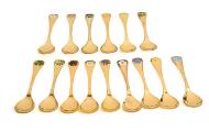 A collection of Georg Jensen gilt and enamelled sterling silver anniversary spoons. Weight 679 g. (15)