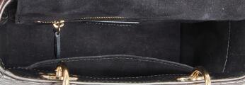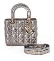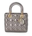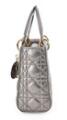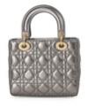 A “Lady Dior” bag of metallic cannage quiltet leather with gold tone hardware, two handles, detachable and adjustable shoulder strap with detachable logo and initials, one compartment with flap closure, two interior pockets, one of which has a zipper, and black suede lining. H. 19 x W. 21 x D. 9 cm. 2019.